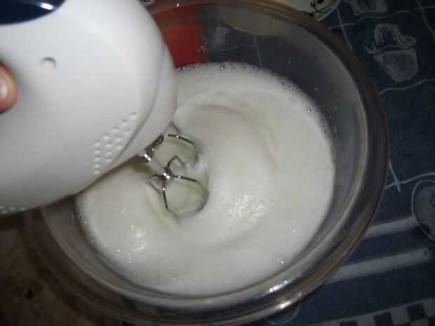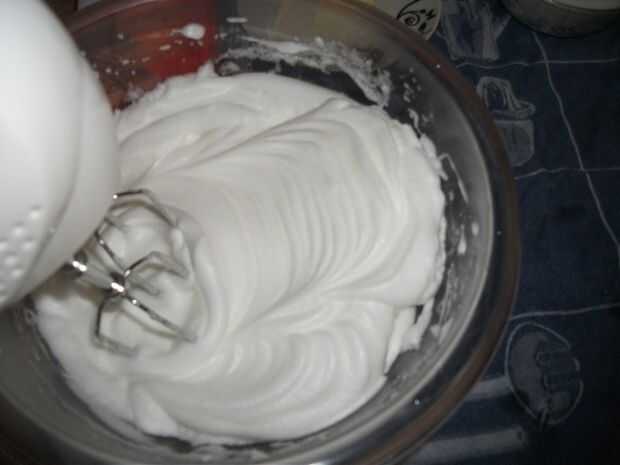 Con un mezclador de la torta, mezclar bien las claras (5-10 minutos) para una textura de nube como de algodón super fluffly, firme.