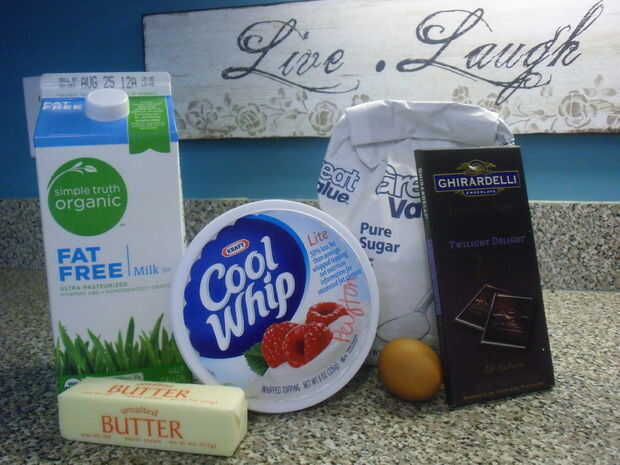 1 3,5 onza premium dark chocolate bar 2 cucharadas de azúcar 1 cucharada sin sal mantequilla 1 huevo grande leche descremada 2 cucharadas 3/4 taza cool whip lite