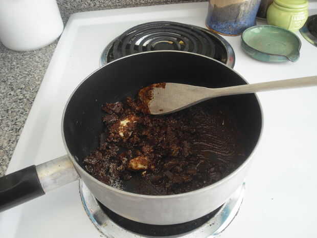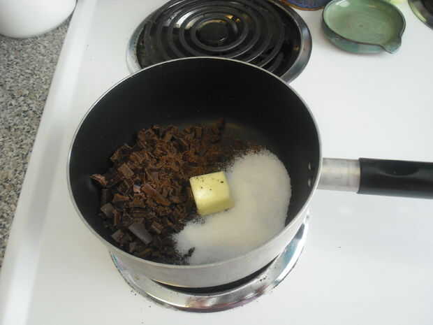 Combinan el chocolate, el azúcar y la mantequilla en una cacerola mediana. Cocinar a fuego bajo, revolviendo continuamente hasta que el chocolate se derrita. Retirar del fuego.
