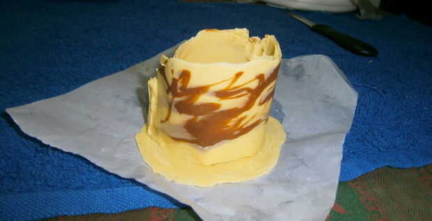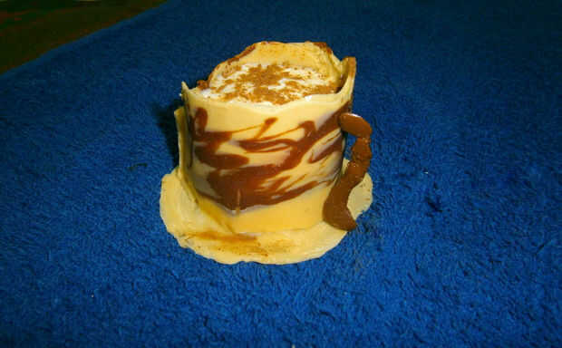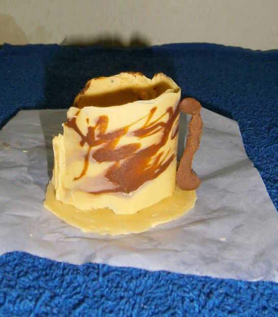 (Tomar la porción de la taza Coloque en un recipiente caliente durante 2 segundos. El chocolate empezará a derretirse un poco. Esto puede utilizarse para colocar las tazas firmemente sobre el plato.)