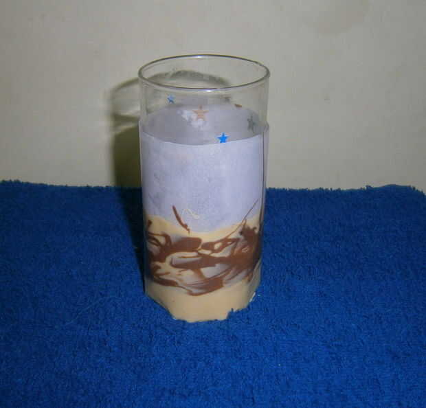 Una vez endurecido durante 1 minuto con cuidado enrolle el papel para hornear con chocolate en el vaso sobre el papel anterior. Poner en la nevera.