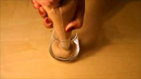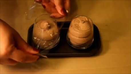 Tubería o una cuchara mezcla de mousse a pequeño de vidrio. Envolverlos con film transparente y poner en la nevera durante 2-3 horas.