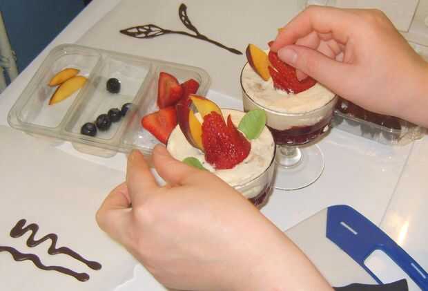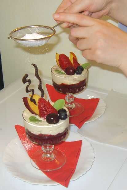 Cortar las bayas y adornar la mousse de plátano con ellos (organizar las bayas la forma que desee). Sacar los adornos de chocolate del congelador y péguelos en el mousse de banano detrás de las bayas. Espolvorear con azúcar glas.