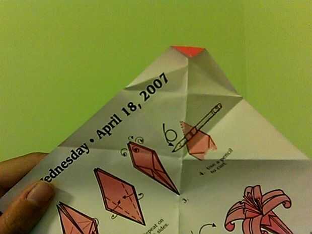 En la parte superior de la Plaza debe haber un doblez muy pequeño triángulo. Doble hacia abajo por lo que está mostrando el color.