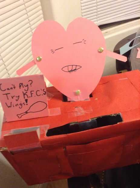 reciclado de cartón, cinta, tapas de mantequilla de maní = Minion!  Estábamos tratando de pensar en un cuadro del día de San Valentín para una fiesta de escuela cuando se nos ocurrió la idea de combinar el concurso de Instructables con la caja de San