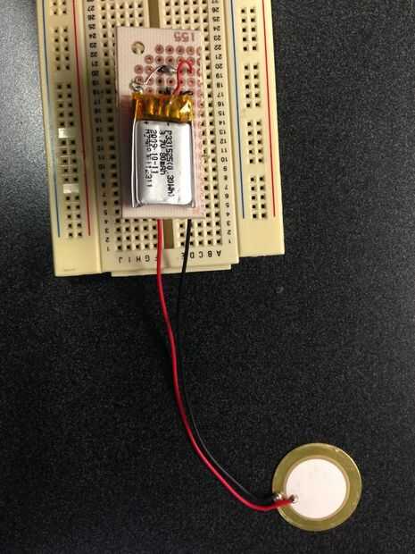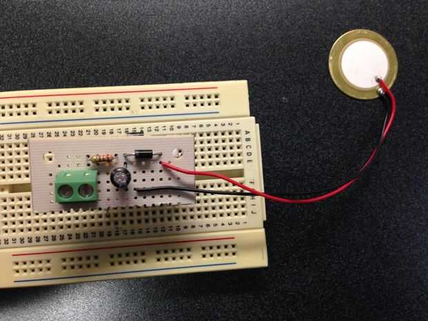 El terminal positivo del sensor piezoeléctrico está conectado al ánodo del diodo D1, que se utiliza para rectificar la tensión proporcionada por el sensor, permitiendo voltajes positivos sólo, el condensador C1 mantiene la tensión durante un período corto de tiempo, y la resistencia nos da la corriente necesaria para cargar la batería.