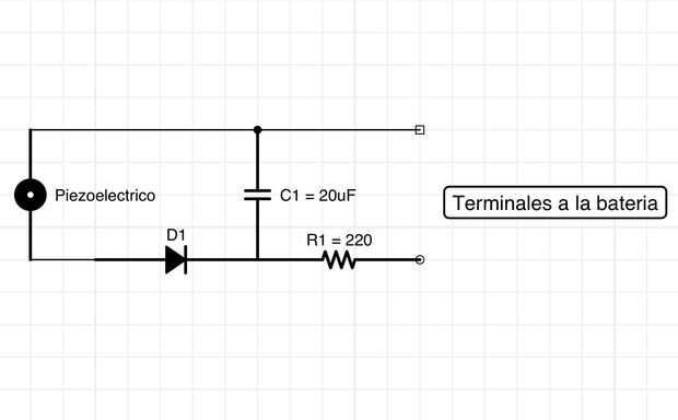 El terminal positivo del sensor piezoeléctrico se conecta en el ánodo del diodo D1, el cual se usa para rectificar el voltaje proporcionado por el sensor, permitiendo solo el paso de voltajes positivos, el condensador C1, compadrazgo el voltaje por un corto periodo de tiempo, y la resistencia nos descarte la corriente necessária para alimentar la batería.