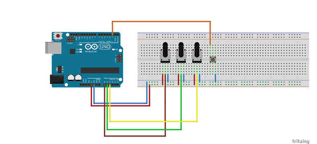 Conectar los botones a los pines A0, A1, A2 y botón al pin 2. Botón del tacto también puede usar 10k resistencia o resistor de pull-up. En este ejemplo utilizo la resistencia de construir-en pull-up.