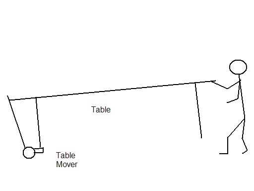 Si ejecuta en un área estrecha y no puede obtener suficiente radio de giro para hacer una esquina, etc..; manualmente gire el extremo de la mesa según sea necesario y fijar el mover de la mesa debajo de la mesa otra vez. A veces para sacarle de un apuro colocando el mover de la mesa en el extremo opuesto de la mesa y arrastrando o empujando la tabla para conseguirlo a donde usted lo desee.