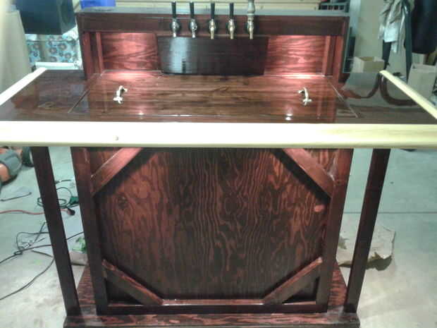 6 luces de xenón funciona encendido un touchpad pequeño escondido junto a la casa de grifo. Accesorios de latón. Manijas de bronce para levantar la parte central. ¡Me encanta!