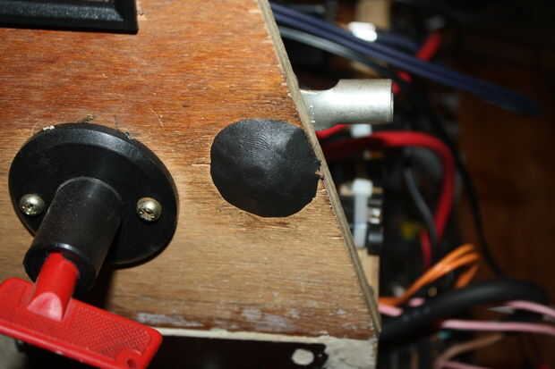 Otra cosita de seguridad fue donde pasó el cerrojo para el fusible del carro hacia el exterior de la caja lo cubrió con un trozo de Sugru, que debería hacer más difícil para alguien que corta el sistema por error.