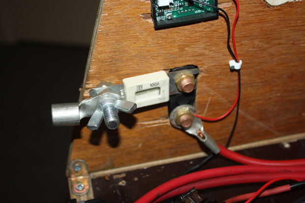 También me fijo en un fusible de 100A carro directamente en el interruptor del aislador. Se trata de un fusible bastante grande y tienes la esperanza de nunca golpes. Pero es un fail safe y no es mala idea.