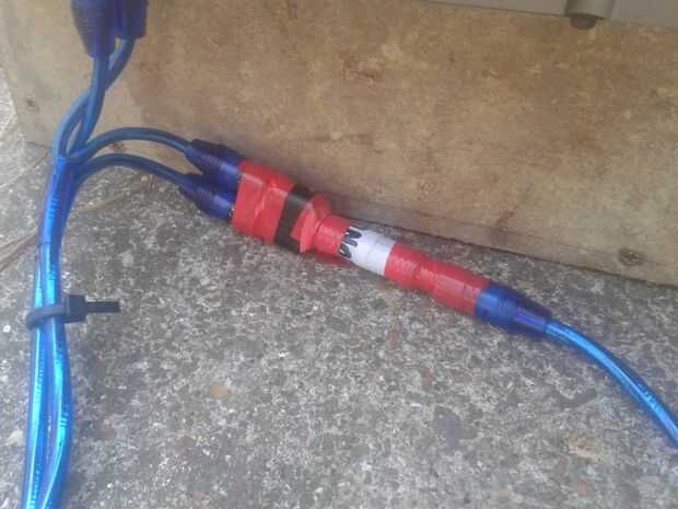 Como todos los altavoces en una caja grande y tenemos una extraña variedad de altavoces, estéreo no tiene mucho sentido, es mejor enviar la misma señal a los altavoces. Amp1 es puenteable, lo que significa que puede actuar como un amplificador mono. Amp2 no es puenteable, así que compramos unos conectores de audio que básicamente un estéreo a una salida mono, pedacito de un hack, pero parece que funciona.