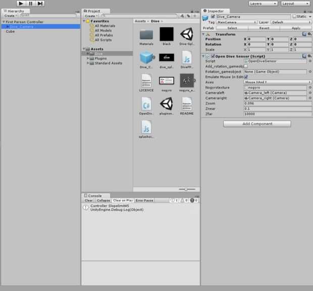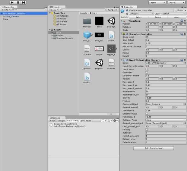 Para configurar un controlador VR primera persona muy básicos que seguirá el movimiento de la cabeza, usted necesitará modificar predeterminado controlador de primera persona, que puede importar haciendo clic (activos > paquete de importación > regulador de carácter). He incluido imágenes que muestran la vista inspector para el padre y el niño los objetos para el controlador del personaje. Usted tendrá que eliminar la cámara que está incluida en el controlador de primera persona. El objeto de "Gráficos" fue eliminado en el proyecto de ejemplo, no debería interferir en cuanto sé, sino que eliminaría también si no sabes lo que estás haciendo. De los activos de buceo, usé la prefabricada "Dive_Camera" como un hijo del primer controlador de persona y sustituye todas las secuencias de comandos en el controlador con el script "DiveFPSController".