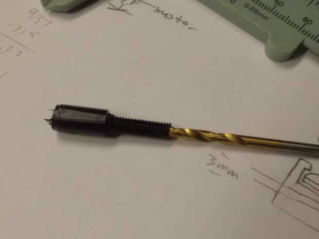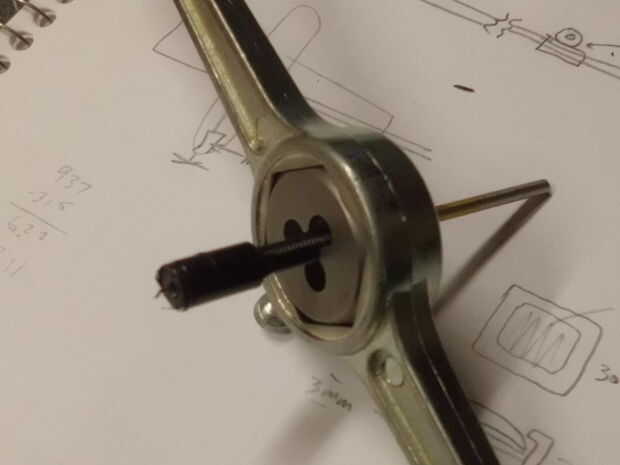 Sucede que tiene un torno de Sherline que podía tomar 2" 0,25" 0,25" enchufe de plástico negro y girar hasta un diámetro de cilindro de 0,200 pulgadas (un poco más que el diámetro mayor de 10-32). Yo entonces centro perforado con un taladro #31 (3mm) y poner el taladro en el agujero para evitar que se derrumban durante la ejecución de la matriz de 10-32 abajo unos 7/8 de pulgada. Córtelo a la longitud de 3/4 de pulgada.