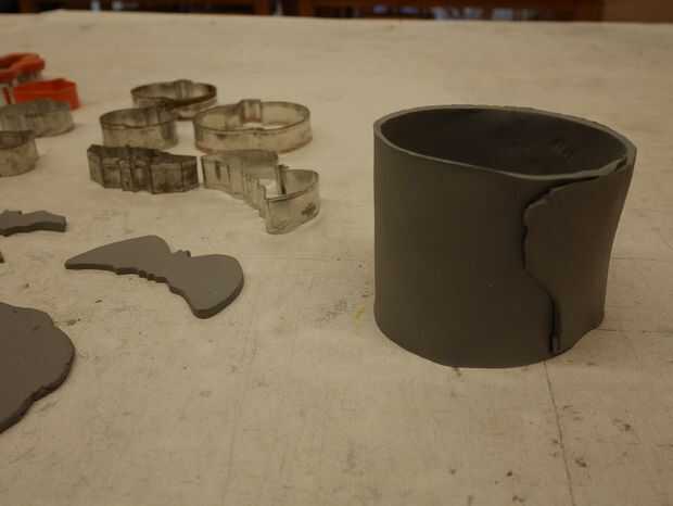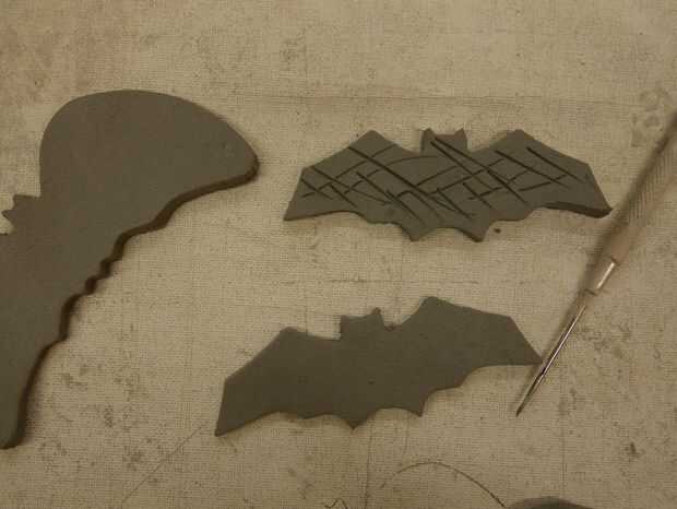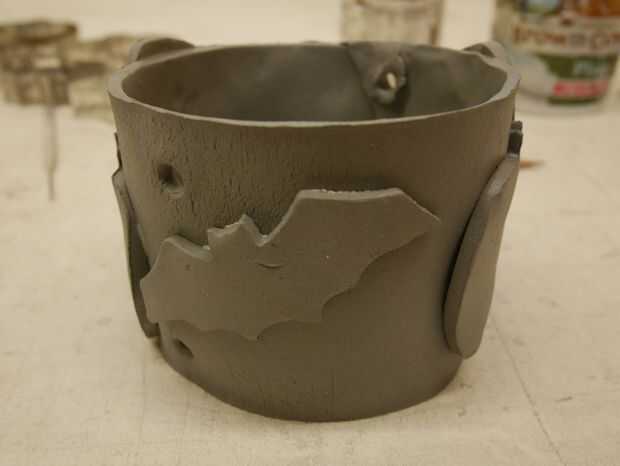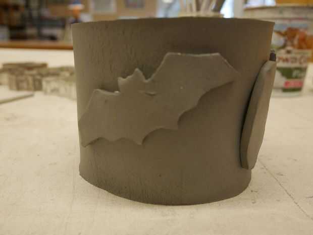 puntuación de los murciélagos y utilizar rub slip (mojada arcilla extra y trabajar en una textura mantecosa hacer resbalón) en la arcilla anotó formas y presione suavemente en el cilindro