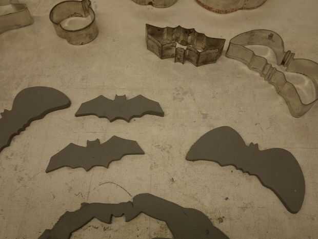 girar a la losa en un fresco de cilindro más arcilla para cortar varios murciélagos de cortador de galleta