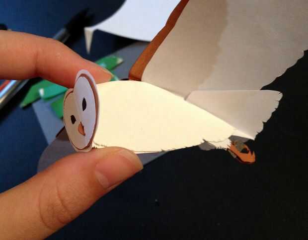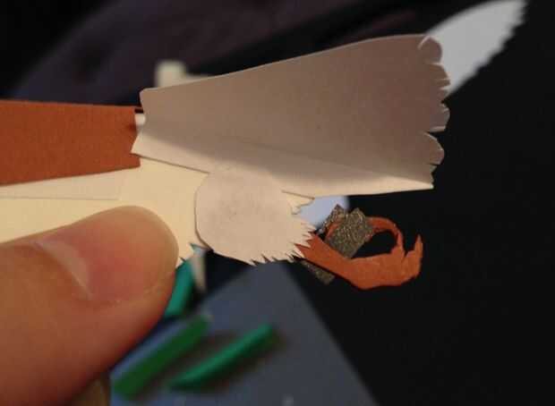 - las piezas principales (en orden: base, acento de plumas, negro "mascara", cara, pico)
