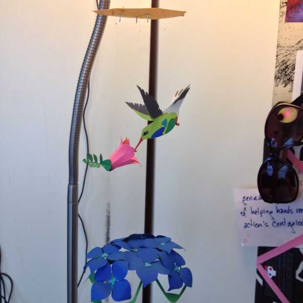 Verano siempre me hace pensar en las cosas en el aire---aves, insectos, polen... Después de pensar en colibríes durante unos días, hice uno de papel. Los colores brillantes y la ligereza del material se prestan bien a los que representan a algo tan delicado y casi etéreo como un colibrí. Así que aquí tenía este encantador pequeño colibrí de papel; la única pregunta era qué hacer con él! Entrar en móviles. Qué mejor lugar para un pájaro que en el aire.