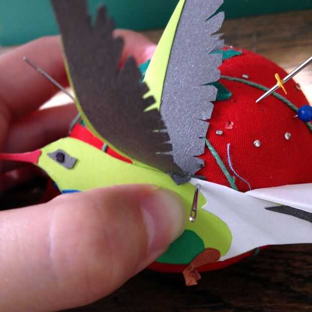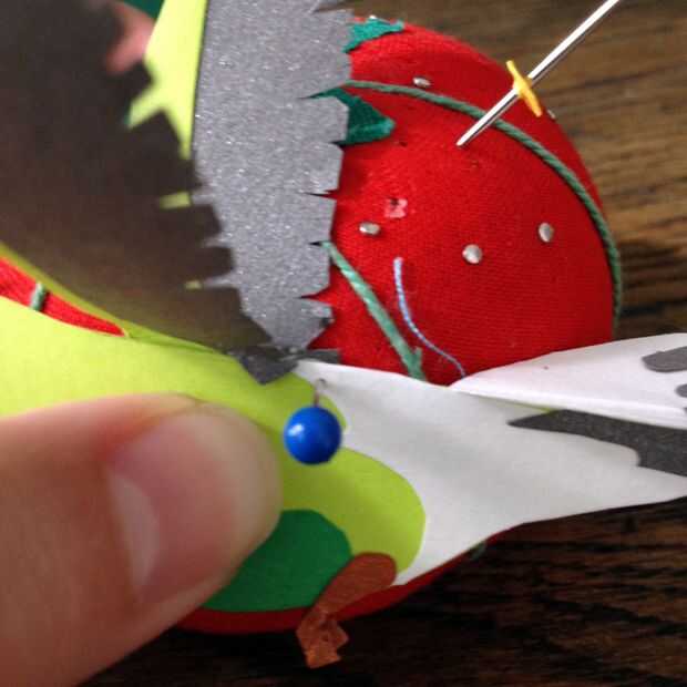 Utilizar un alfiletero como forro para agujeros sobresaliendo en los elementos y la base---esto reduce al mínimo daño al papel. El tamaño del orificio necesario depende del tipo de cadena que se va a utilizar. Por razones estéticas o cadena más grande de diámetro, empujar primero con un alfiler y seguir con una aguja de gran calibre, como se muestra.