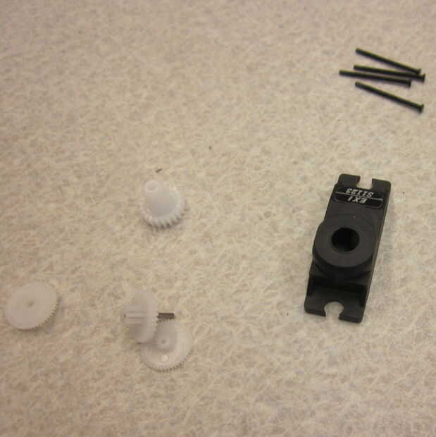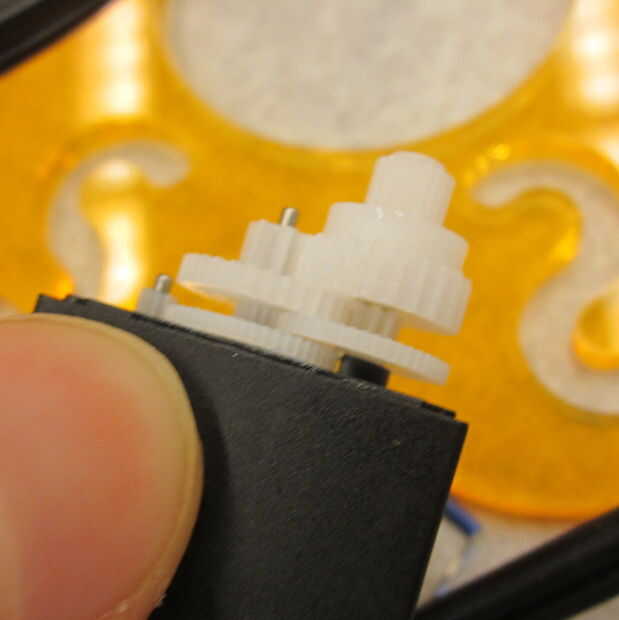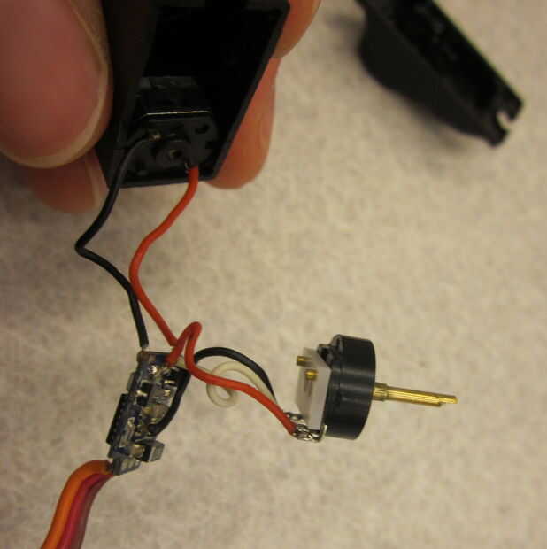 El potenciómetro (pot) dentro del servo dice tiene el servo en qué posición está. Para permitir el movimiento continuo, queremos que el servo a pensar que el bote está en el centro en todo momento, por lo que cualquier valor distinto de 0 grados hará que gire. El bote tiene una gama de 5k, por lo que puede reemplazar el bote con resistencias de 2.2K dos (no Pregúntenos acerca de las matemáticas--esto fue recomendado a nosotros). El bote es el dispositivo cilíndrico dentro del cuerpo que tiene un eje conectado a él. Cortar los alambres sosteniendo la olla por lo que puede extraer la olla de la carcasa. Solde un resistor de k 2.2 entre el cable blanco (señal) y el cable negro (tierra) y otra resistencia k 2.2 entre el cable blanco y el cable rojo (corriente). Utilice cinta eléctrica o calor tubería del encogimiento para aislar las conexiones. (Luego con mucho cuidado!) volver a colocar el pote y el eje y asegúrese de que todos los componentes de ajuste en el cuerpo del motor. Una vez todo en su sitio, vuelva a enroscar la cubierta.