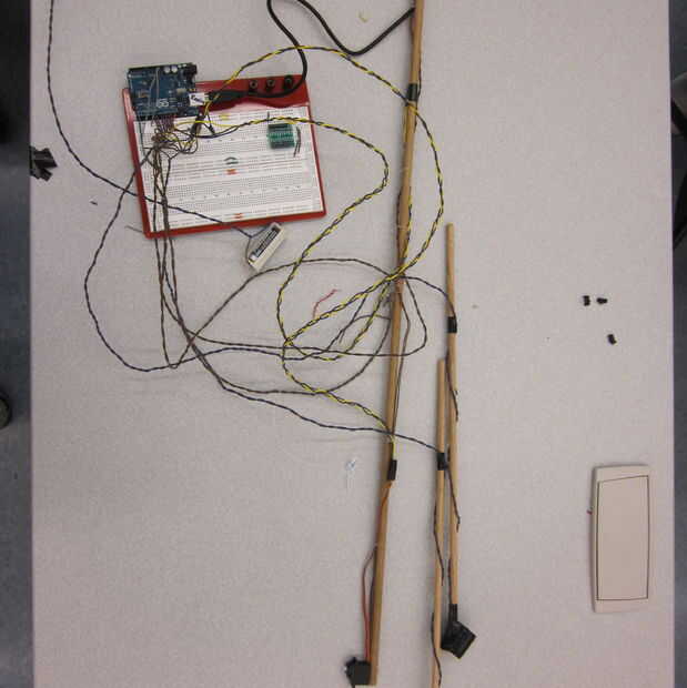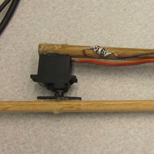 Nos pareció útil para poner a un lado del teléfono móvil y marca las longitudes de los tacos nos gustó, luego cortar dos de cada una de las longitudes que queríamos (el móvil en el otro lado del espejo). Una vez que tengas los tacos en los largos que te gusta atar las piezas necesarias en los extremos de las clavijas correspondientes utilizando la línea de pesca. Asegurar la línea de pesca a la clavija con el pegamento caliente. Una vez que tengas todos los componentes del sistema, equilibrar el móvil, a partir de la parte inferior. Atar el sedal al centro de la espiga inferior, encontrar el punto de equilibrio y pegue la línea de pesca en el lugar. Luego atar esta rama hasta el final de la espiga mediano con el arco iris en el otro extremo y seguro. Balance de esta rama, luego atar a un extremo de la otra media espiga. Equilibrar la espiga luz final y seguro hasta el otro extremo de la espiga mediana. Finalmente, esta rama del balance y fije un horn de servo directamente en el punto de equilibrio con sedal y pegamento caliente. Repita este proceso en la otra rama. Colocar un servo en cada extremo de la espiga pesada, usando pegamento caliente. Puede ser útil para solucionar problemas de la Asamblea móvil antes de conectar los servos a los cuernos, pero eventualmente se caliente pegamento los cuernos servo a los ejes del servo; Esto es necesario debido al peso de las ramas, aunque las ramas no son muy pesadas. Trenzar los tres hilos de cada servo juntos y seguro ellos a lo largo de la varilla de pasador grueso, que se reúnen en el centro.