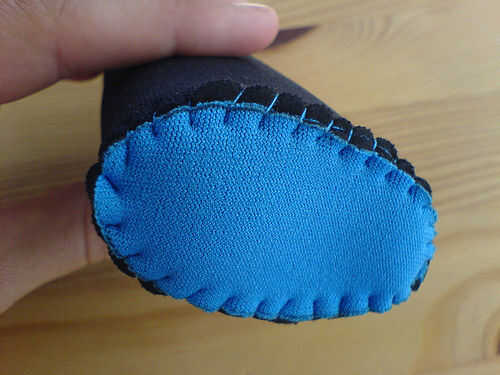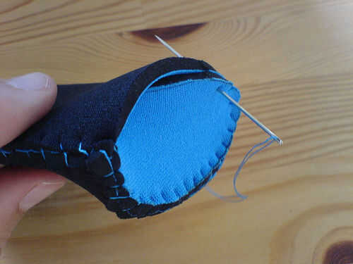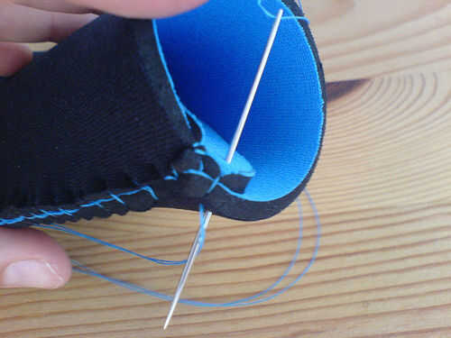 La última puntada la puntada doble y hundir la aguja a través del neopreno para 2, 3 cm y luego cortar el hilo y se deben llevar a cabo.