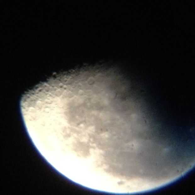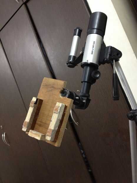 Quería tomar fotos usando mi telescopio básico así que hice un montaje para mi iPhone, que se fija en un ocular adicional. No hay nada especial en esto pero su cómo levantarse del eje de la pieza de ojo con lente de la cámara.