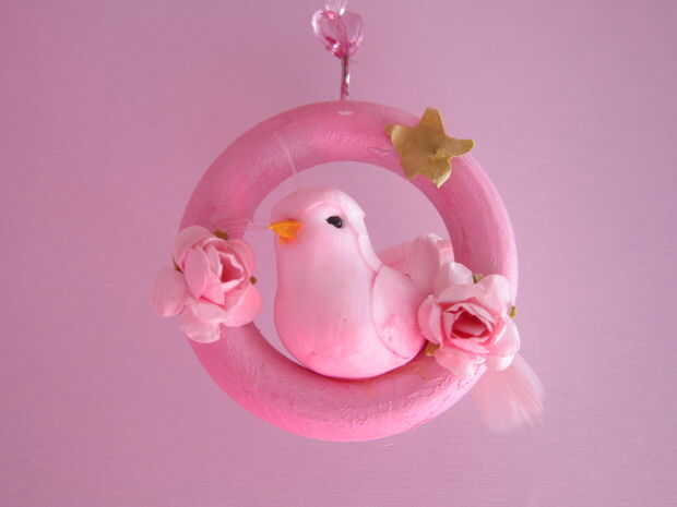 Después de que el pegamento se haya secado, corta trozos de hilo de pescar o cuerdas en diferentes alturas y corbata cada pedazo a una cortina del anillo en el gancho, luego se corta la pieza de cartón a un motivo de su elección, como un cuadrado, círculo, corazón, lo que sea, y luego pintar o colorearlo. Una vez que se seca, cortar un círculo perfecto en medio de la forma y ate la cuerda conectada a cada anillo de cortina al círculo en el centro de la pieza.