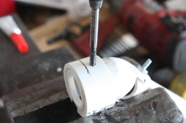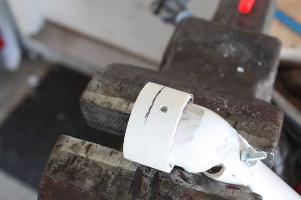 Saque la varilla y retire el tubo. Perfore un agujero de 1/8 en un lado de la conexión a través del anillo de 1 pulgada para que el agujero iría a través del tubo de 1/2 pulgada (si fuese en la guarnición). Golpee ligeramente el agujero con el grifo de 8-32, armar nuevamente la articulación e Inserte un tornillo 8-32 en el agujero que ha perforado. El tornillo se bloquea en este lado de la articulación.