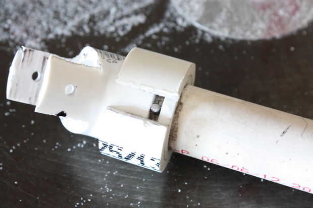 Poner el anillo cortó la conexión y pone la varilla de 1/8 de pulgada en el agujero taladrado en la tubería de 1/2 pulgada. Deslice el tubo en el accesorio y el anillo de montaje en el anillo de 1 pulgada.
