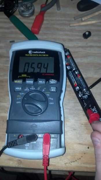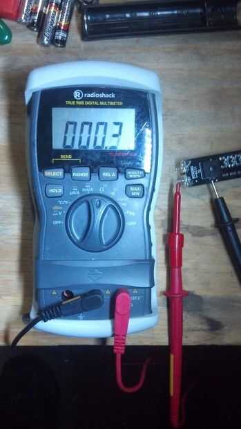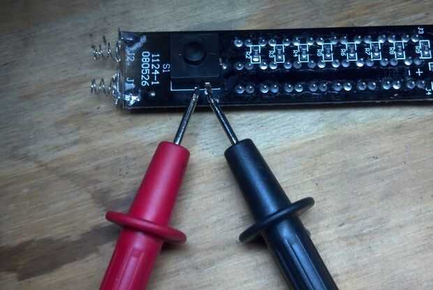 Cada batería de AAA en esta luz proporciona aproximadamente 1,5 voltios, un voltaje combinado de acerca de 6V. Ponga el interruptor de selección multímetro en la función de voltaje ("V" con una línea recta sobre él, se muestra en la primera foto). Si el multímetro no tiene auto-ranging, gire entonces el dial a la posición DCV primera superior a 6 voltios (generalmente 20). Con el interruptor de la luz en la posición de apagado, coloque la sonda negra en el el resorte de la batería más cercano a la placa, que toca el lado negativo de una batería. Compruebe la conexión mediante la colocación de la sonda roja en el muelle más cercano a la Junta que toca un terminal positivo de la batería. El medidor debe leer alrededor de 6V. Mantenga la sonda negra en el que es y tocar la punta de prueba roja a cada uno de los pines del interruptor. También, uno de ellos leerá un voltaje que es mayor que cero, mientras que el resto de ellos lee cero. El resultado puede no ser 6V debido a otros componentes en el circuito. Que pin es mayor que 0V será el pin que está conectado a la fuente de batería. Se trata de uno de los pasadores que se suelda un cable a. Si las puntas de prueba fueron invertidas para que el negro fue conectado con el lado positivo del circuito, la única diferencia es que el voltaje se mostrará como un valor negativo.