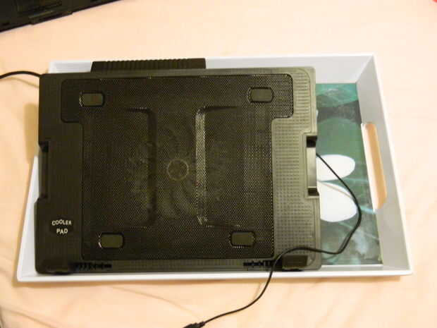 Confinando el portátil a una bandeja podría alterar la ventilación, así que instalé un cojín de la refrigeración. Todavía se puede ver el cable de red a la izquierda.