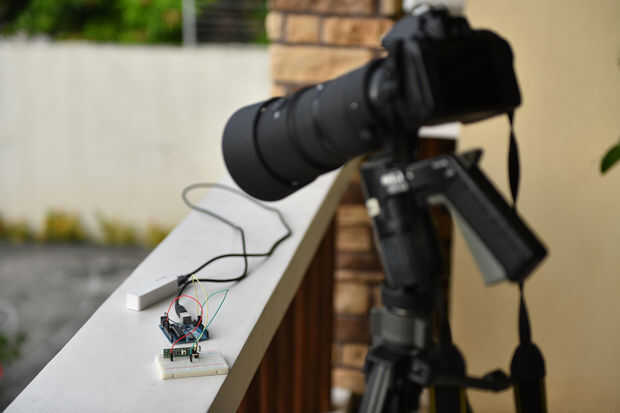 He aquí, un movimiento de largo alcance disparado sistema remoto DSLR! Construir un dispositivo que automáticamente toma fotos de objetos en movimiento cuando no estás alrededor. Es la configuración de fotografía de vida silvestre independiente perfecto.