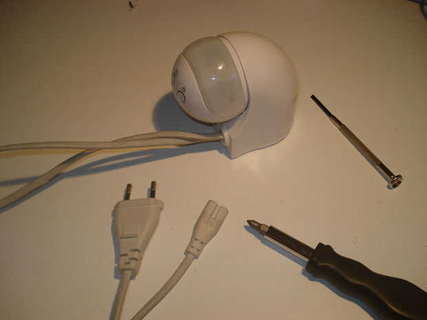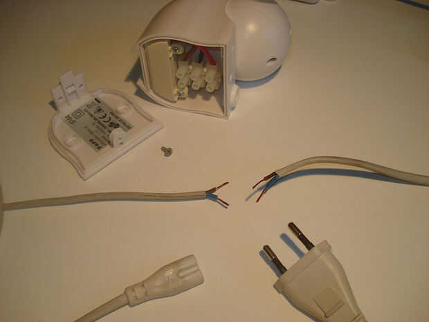 Asegúrese de que el cable de alimentación esté desenchufado! Corte en el medio y preparar conduce como se muestra.