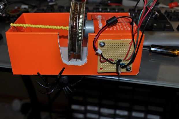 en esta Intstuctable que voy a mostrarte cómo hacer una araña muy simple movimiento activado que cae rápidamente y asusta a cualquier persona que camina por debajo, entonces se retrae. Diseñé este es un proyecto de electrónica barata y práctica que un principiante puede hacer. El sensor directamente acciona un transistor que funciona un motor para el carrete hacia abajo de una araña. La bobina se une a una banda de goma, cuando termina el pulso del sensor, el motor gira la banda de goma los vientos hacia arriba. La velocidad de la caída de la araña puede ajustarse simplemente enrollar la goma más o menos, de un lento realista decente a una plomada sorprendente.