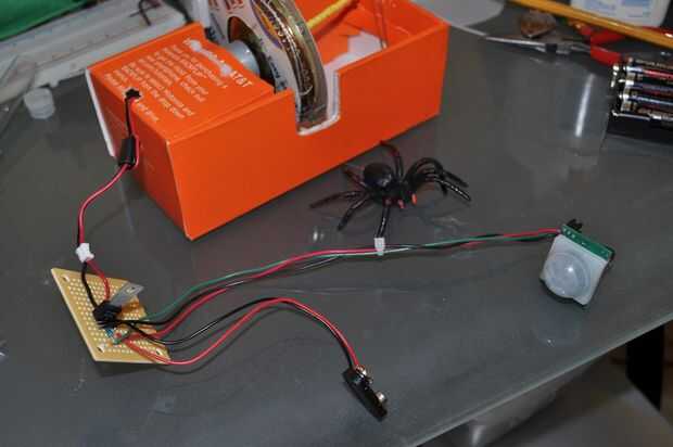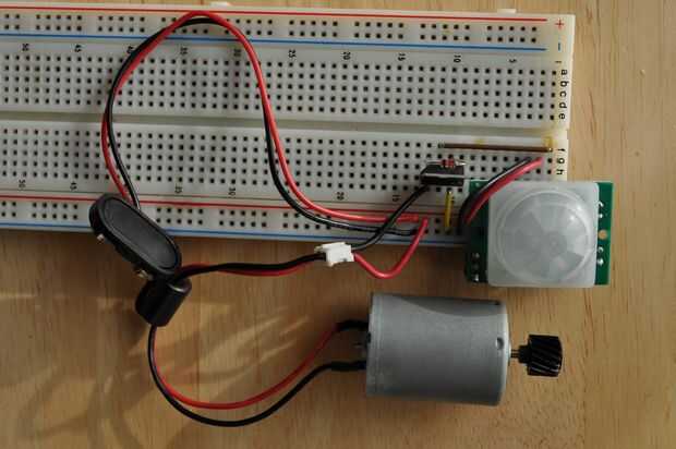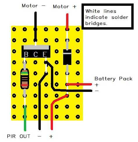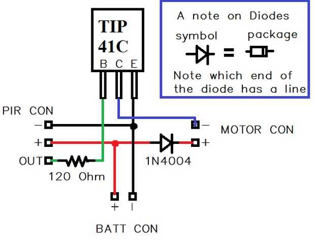 El transistor funciona como interruptor, permitiendo un flujo de corriente desde el terminal negativo del motor en el colector (denominada C) y emisor (marcado E) cuando obtiene una señal positiva de PIR en la base (etiqueta B). Tenga en cuenta cuando usted sigue este diagrama si se utiliza un transistor de sustituir estos pines pueden ser en un orden diferente. Aunque generalmente son como se muestra.