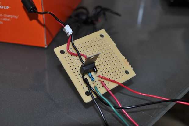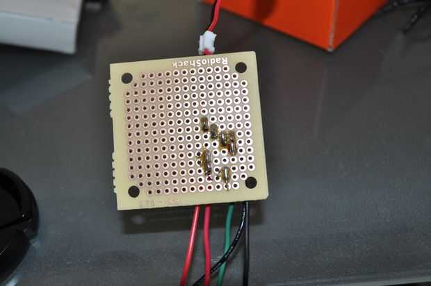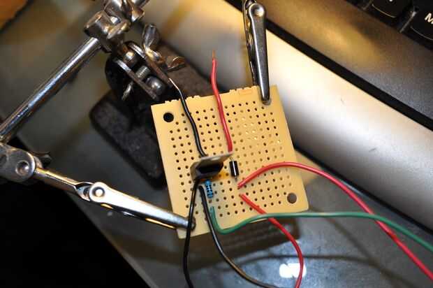 Ahora, para hacer el circuito. Mi método preferido para artículos que son demasiado simples fabricar un PCB, como este, es el punto de soldadura en una Junta de perf. Cada uno de los componentes se pone a través de la placa, los cables están doblados para sujetarlo, luego se recorta el extra de. El cuerpo del componente debe estar en el lado simple y los cables si se pega por el lado del agujero plateado. Cada componente a la placa de la soldadura y puente de la soldadura de los puntos que necesitan ser conectados mediante la adición de algunos y arrastrar con la plancha hasta que los puntos de fusión de la soldadura.