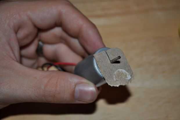 Ahora toma la tapa de la leche con la goma en ella, aplica pegamento caliente a la parte restante del eje del motor y presione hacia abajo el eje. Si eres más paciente uso pegamento epoxi o gorilla para esta parte.