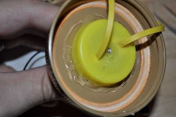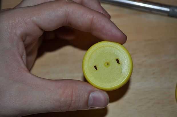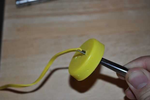 Utilice una broca de 1/16 para poner un agujero en el centro de la tapa del frasco de plástico, si usted está utilizando un motor con sin equipo, en caso contrario utilice lo que hace de diámetro caben más allá de la marcha. Poner dos orificios muy juntos al lado de la pared del tambor de la tapa de plástico entre donde van las dos bridas. Estas se utilizarán para fijar la cuerda más adelante y poner en el centro de la pared hace menos probable que saltan de la bobina.