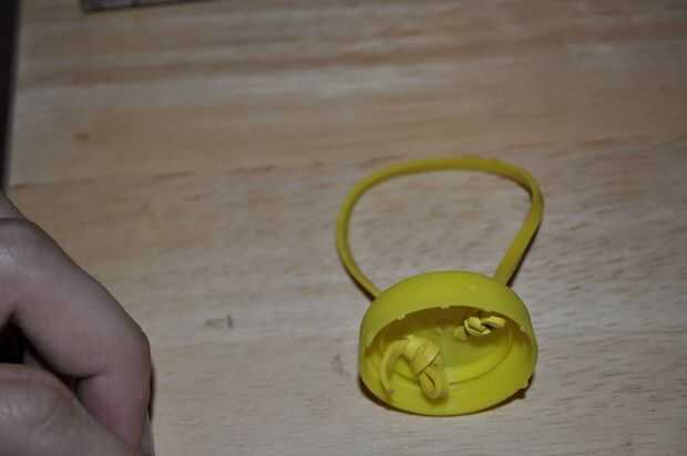 Tome la tapa de la leche y hágale un agujero en el centro, no necesita ser extremadamente exacta. corte dos ranuras de la banda de goma de 1/4" desde el centro a cada lado. (primera foto) Cortar la goma en un solo lugar e introducir un extremo en cada ranura en la tapa. Un nudo en cada extremo para sostener. Doble él encima y
