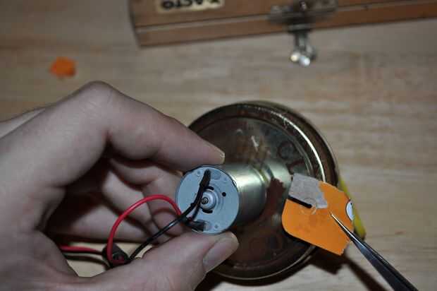 Empuje la tapa del frasco de plástico sobre el eje del motor, parte superior contra el lado abierto del motor lejos de él, hasta que quede contra el espaciador. Manteniéndolo presionado contra el motor, aplicar una pequeña cantidad de pegamento. Compruebe que es bastante constante al girar antes de pegar todo, un poco excéntrico está bien, esto no va a ir muy rápido. Una vez que esté lo suficientemente recta pegamento alrededor del eje del motor donde se encuentra con la tapa.