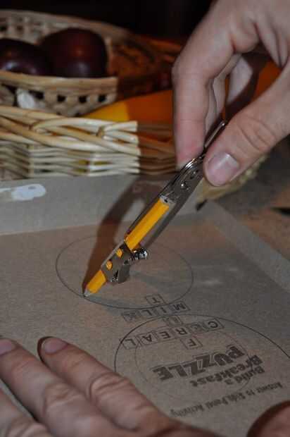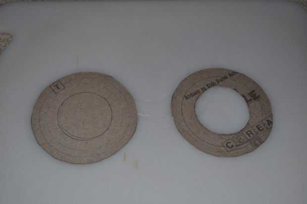 Para hacer caras para el carrete algunos más cartón de una caja de cereal y marcar dos formas de Donut con una brújula. El diámetro interior debe ser al menos 1/2" dentro de la tapa del frasco que era de un diámetro de 2" en mi caso, y debe ser el diámetro exterior de 3/8" fuera de ella, que me dio un 3-1/2" de diámetro.