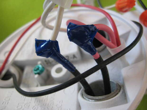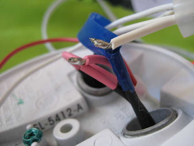 Con ésos corte, la luz se deslizó fuera, y entonces me deslicé el enchufe de la carcasa. Cuando que hecho, lanzó la cubierta en la pila de chatarra y corrió todos los cables a la toma de corriente por donde había tirado fuera de. Había pelado de los cables blanco y rojo, había soldado todo a sus homólogos correctamente colores y envuelto con cinta aislante.