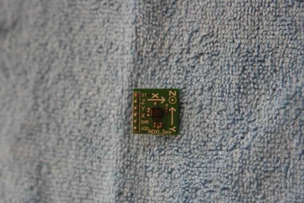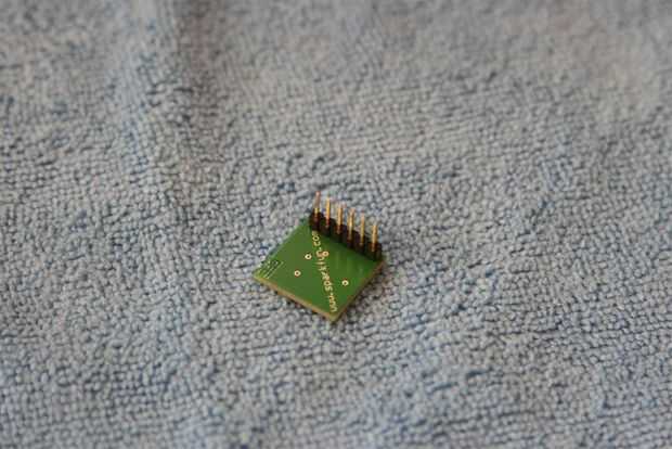 De la soldadura de los conectores macho de 6 pines para el acelerómetro. El lado corto de los pernos debe salir de la parte superior del acelerómetro y los extremos largos en la parte inferior. La soldadura en la parte superior. Ver la foto.