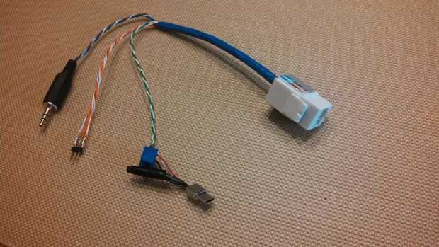Dependiendo de su configuración, por lo tanto, necesita entre tres y ocho cables para comunicarse entre los dos extremos del efecto. En mi caso, se dio cuenta de que un cable de red Cat 5 o Cat 6 podría llevar todas estas señales sobre una distancia buena. En lugar de cortar un cable de red perfectamente buena, he creado mis propio jacks RJ45 RasPi y pantalla/IR extremos del sensor de la instalación. Siempre y cuando usted mantenga un esquema de color uniforme entre los dos extremos, debe ser capaz de conectar los dos extremos con un normal cat 5 o cat 6 cable.