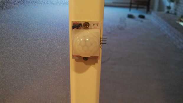 En mi caso al principio había montado el detector de movimiento PIR en el marco de la pantalla transparente, que funcionó muy bien en el interior. Sin embargo al aire libre, el viento causó el fotograma a mover y activar prematuramente el detector de movimiento. Por lo tanto, me mudé el sensor a una estructura adyacente, menos móvil.