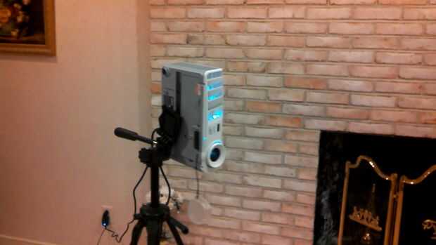 El proyector está montado lateralmente en el trípode para que coincida con la orientación de la pantalla. El objetivo del proyector en la pantalla. Es mejor apuntar el proyector a un ángulo con relación a la pantalla para que la luz del proyector no golpeó a la derecha del espectador en la cara cuando están delante de la pantalla.