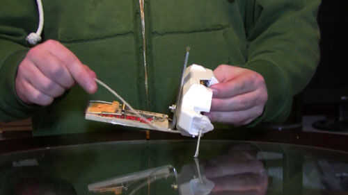 Fije el ambientador de aire a uno de los agujeros medio tornillo en el soporte en L hacia el exterior. Puede hacer esto con todo lo que usted tiene disponible, ya sea pegamento caliente, tornillos, pernos, pegamento, etc.. En el interior del soporte en L, coloque la trampa de ratón. Desea orientado para que el soporte de L es hacia delante y la trampa de ratón está poniendo sobre la mesa.