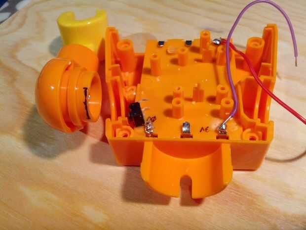 Tomó un poco de trasteo, pero me las arreglé encontrar a justo el tipo correcto de interruptor (un botón de empuje de montaje PCB) y elaborado donde pude montarlo para ser operado por el brazo y no obstaculizar de cualquier otra cosa. Tuve que recortar algunos plástico de la pieza posterior cerca de brazo izquierdo del chico y pegamento estupendo del interruptor en el lugar. (Ver primera foto).